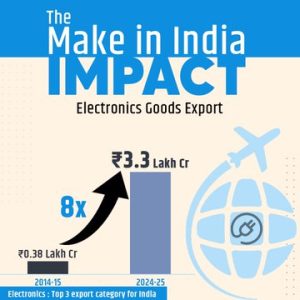 For India, out of the total electronics production worth Rs 11.3 Lakh crore in 2024-25, a strikingly high value of Rs 3.3 Lakh crores is attributed to exports, making electronics rank among the top 3 items exported by India. This also marks an eightfold increase in the export of the electronics item in the year 2024-25, rising from 0.38 Lakh crore in 2014-25.