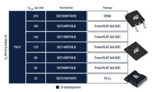 STPOWER GaN Transistors are intrinsically normally off, p-GaN gate e-mode transistors that offer a zero reverse recovery charge. ST offers today seven part numbers rated 700 V breakdown voltage (VDS), with typical on-resistance RDS(on) ranging from 270 mΩ down to 53 mΩ in DPAK, PowerFLAT 8×8, and TO-LL packages.