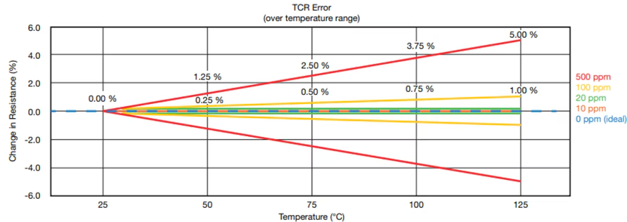 Resistance isn’t constant—it changes with temperature. The TCR quantifies this change, expressed in parts per million per degree Celsius (ppm/°C). In simple terms, TCR tells us how much a resistor’s value will drift as the temperature fluctuates.