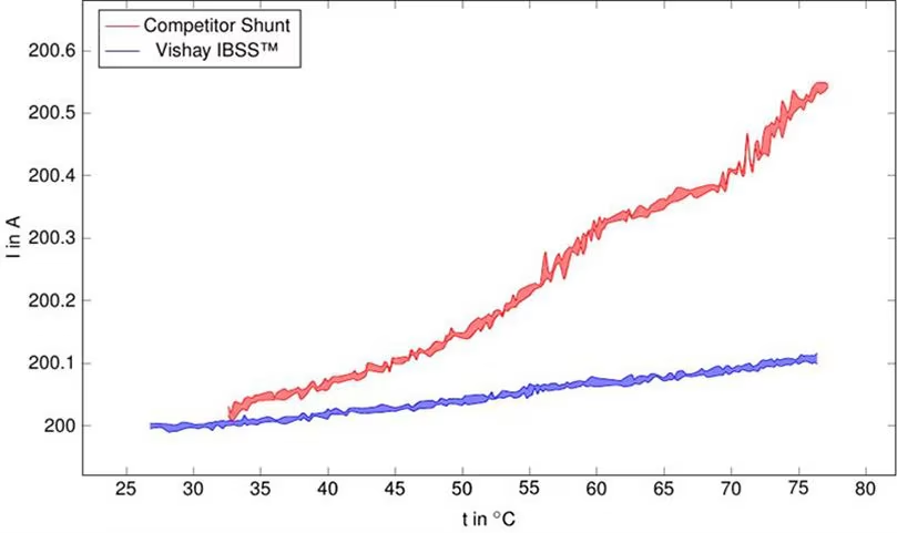 Figure 1 demonstrates that as the temperature rises from 25 °C to 80 °C, the standard shunt (in red) shows a current reading drift from 200 A to over 200.6 A, while Vishay’s (in blue) remains nearly flat at 200 A, highlighting its superior thermal stability. Vishay also delivers cleaner, less noisy measurements, unlike the standard shunt’s non-linear, noisier signal response.
