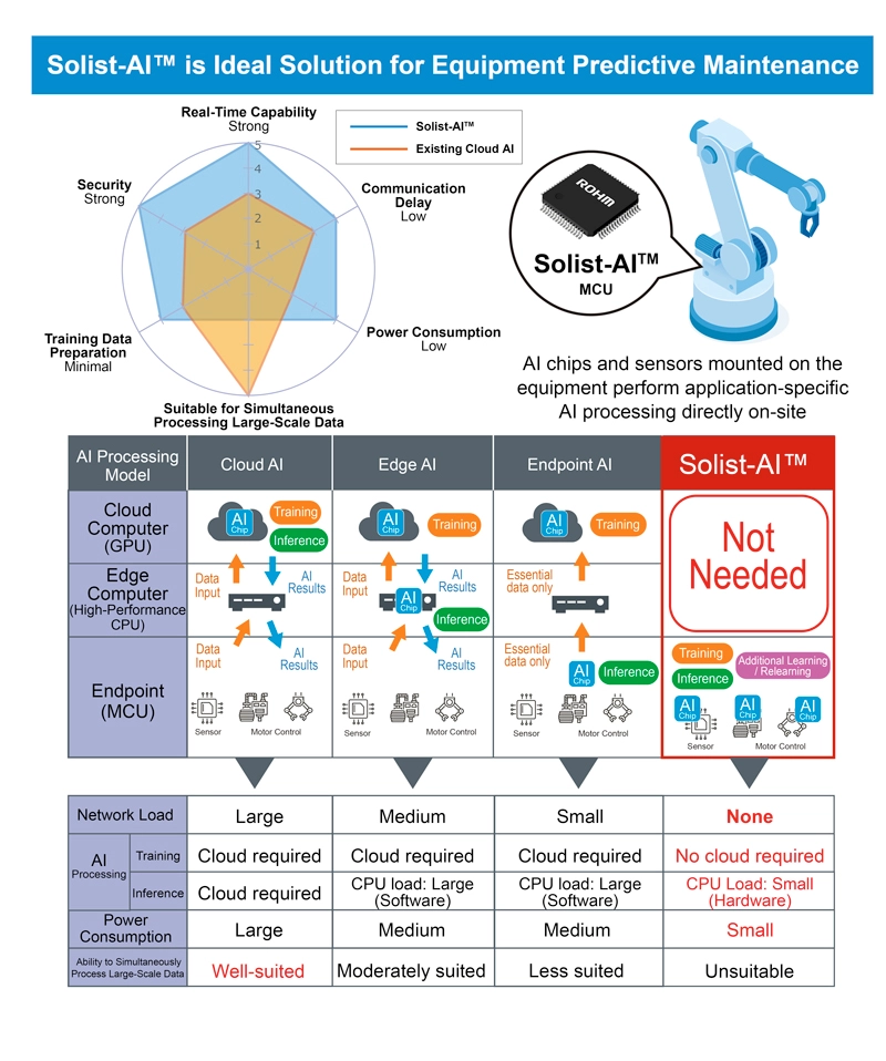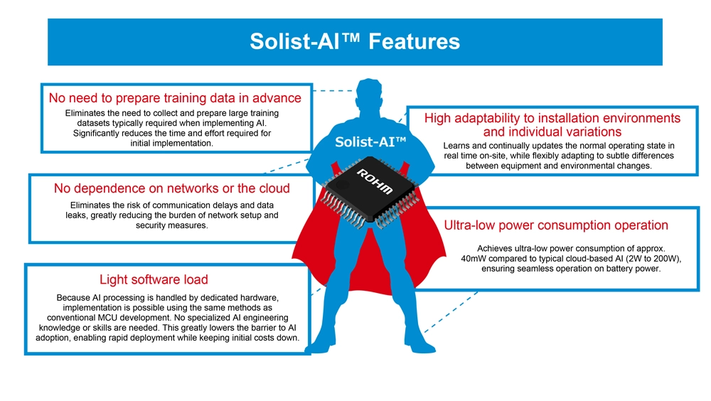 To support this paradigm, ROHM developed Solist-AI, an on-device AI solution optimised for edge computing, which is the core technology behind predictive maintenance. The name is derived from ‘Solution with On-device Learning IC for Standalone AI.’ Just like a ‘solist’ in music who performs independently, Solist-AI™ completes the entire AI workflow, from learning to inference, locally on the device without relying on the cloud or external networks.