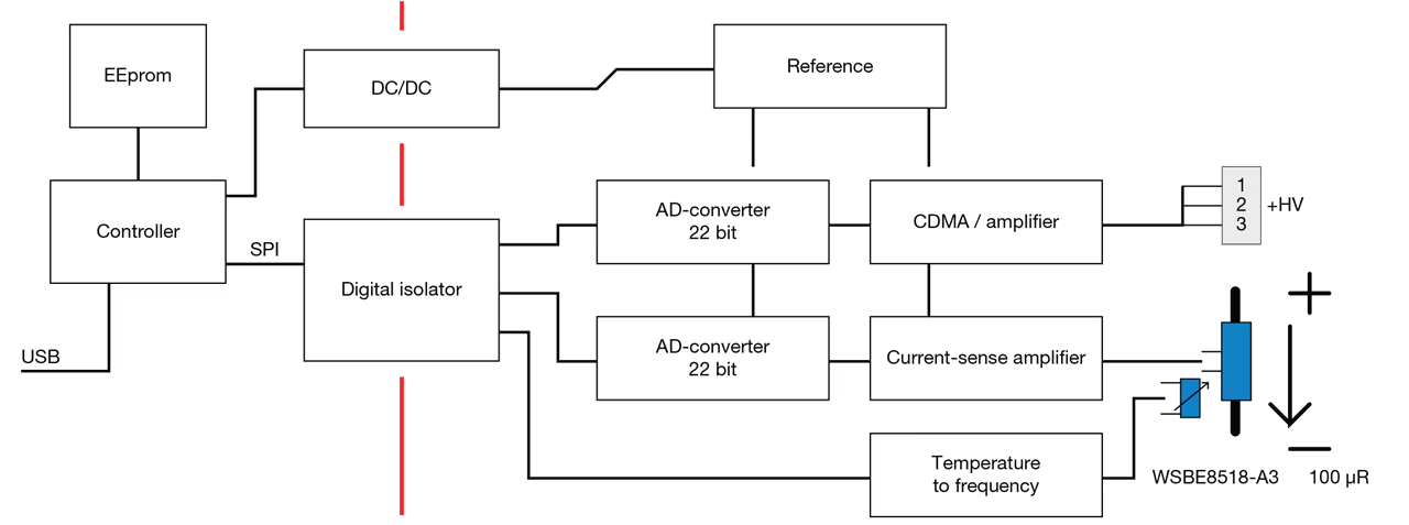 The HV-IBSS-USB reference design features two isolated domains: an HV analog front-end and an LV digital control section. Powered and interfaced via USB, the LV side hosts a microcontroller that manages data acquisition and communication. Power is transferred to the HV domain through a charge pump, where precision 22-bit sigma-delta ADCs and carefully selected analog components enable high-resolution current and voltage measurements.