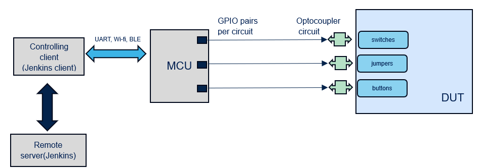 Figure 1 shows the block diagram of automation architecture where a small footprint microcontroller can be used to control an isolation circuit connected to the junctions of switch/jumper/buttons of embedded device under test (DUT). Isolation circuit (e.g., Optocoupler) ensures circuit safety. In the current demonstration NUCLEO-F401RE board (MCU) is used to control the optocoupler circuit connected to boot modes switches and reset button of STM32MP157F-DK2 board under test (DUT). Jenkins will issue remote commands to MCU.